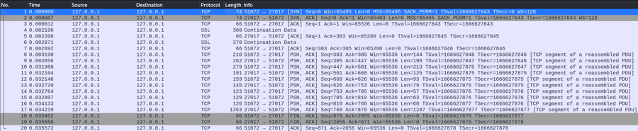The capture contains traffic from an internal service running on port 51072 that connects to the mongodb service running on port 27017.